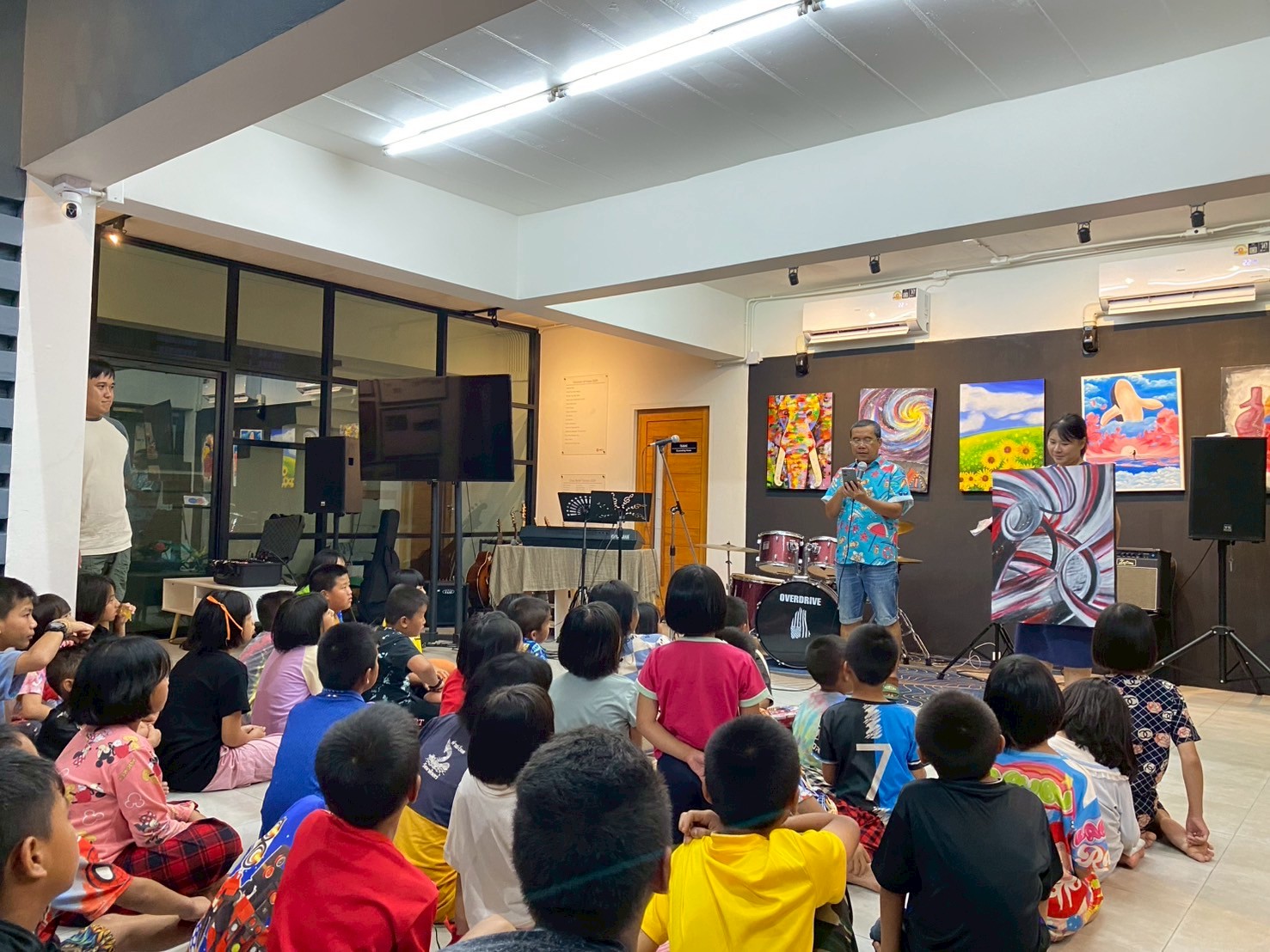 เด็กๆ ได้ใช้พู่กัน สี และมือของตัวเอง ถ่ายทอดความรู้สึกที่อยู่ในใจลงบนผืนผ้าใบ